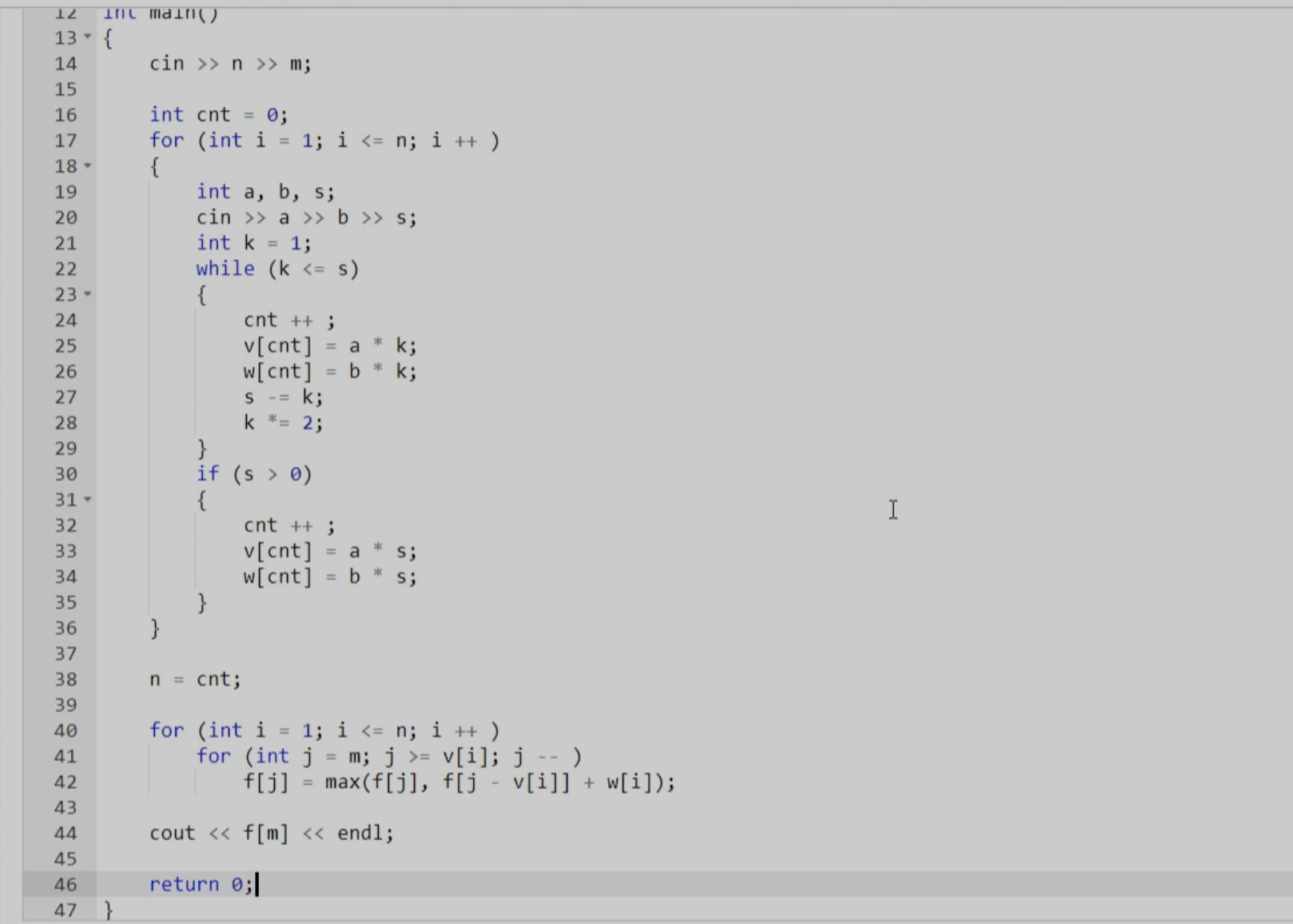 每组物品读入之后,在22-29行按照上面的数学原理拆分为2的幂次,用cnt记录现在的添加物品数量(最后一组直接使用s,而不是下一个2的幂次)。然后转化为01背包问题直接计算即可。