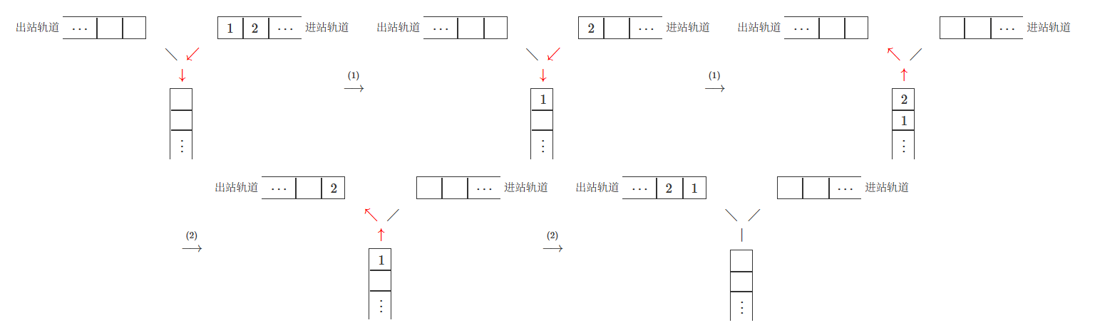 例如按以下方式,可以将进站轨道停靠的车厢 $1,2$,变为出站轨道停靠的车厢 $2,1$。