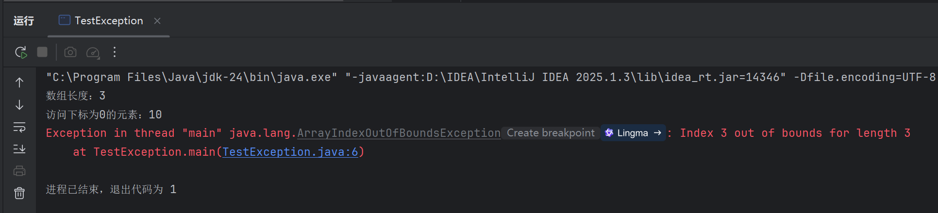3、 编写一个进行数组操作的程序,故意触发 ArrayIndexOutOfBoundsException 非检查型异常。public class TestException {